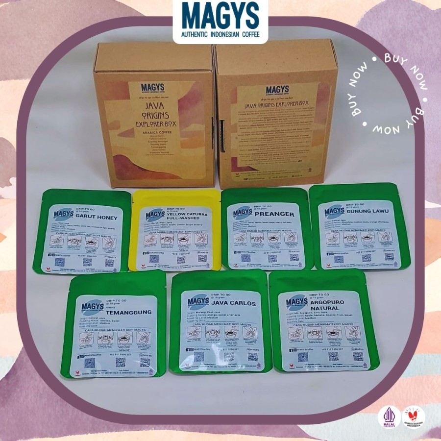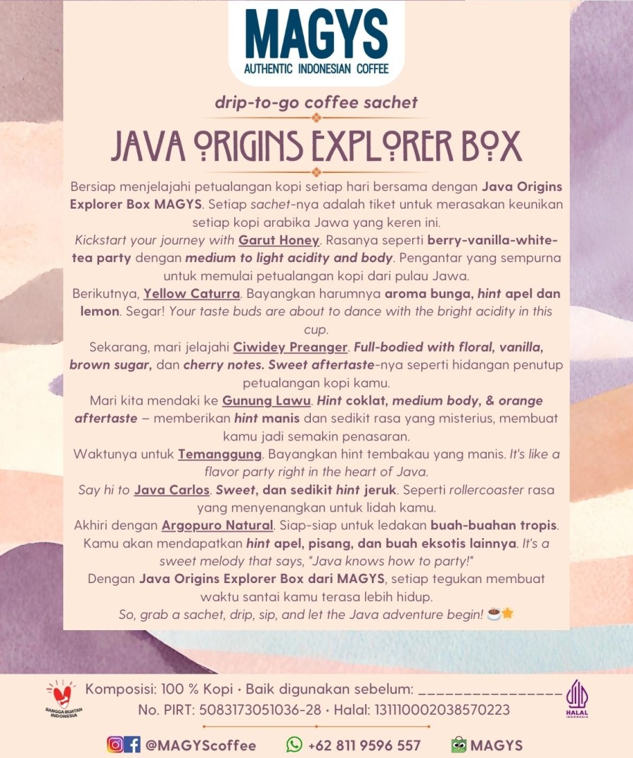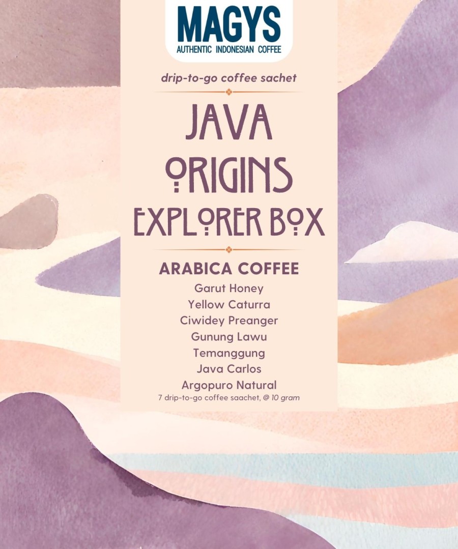 Terdiri dari 7 Drip-to-Go sachet kopi arabika PREMIUM Indonesia yang berasal dari Pulau Jawa: