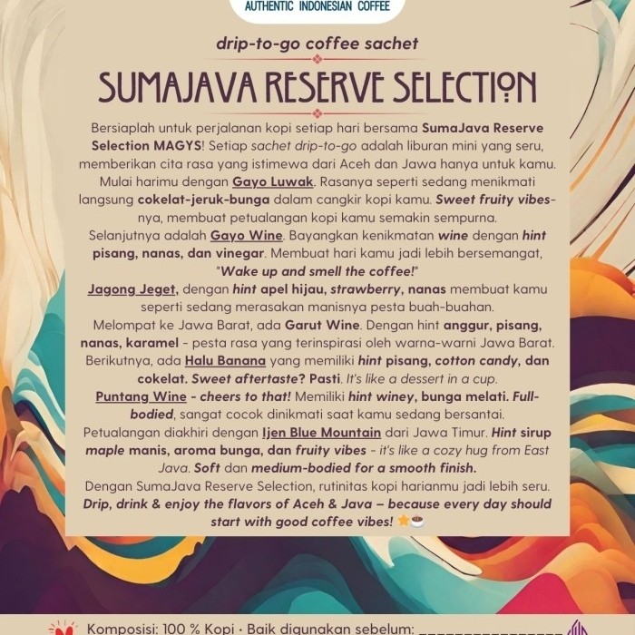 Terdiri dari 7 Drip-to-Go sachet kopi ARABIKA PREMIUM Indonesia yang berasal dari Pulau Jawa dan Pulau Sumatra: